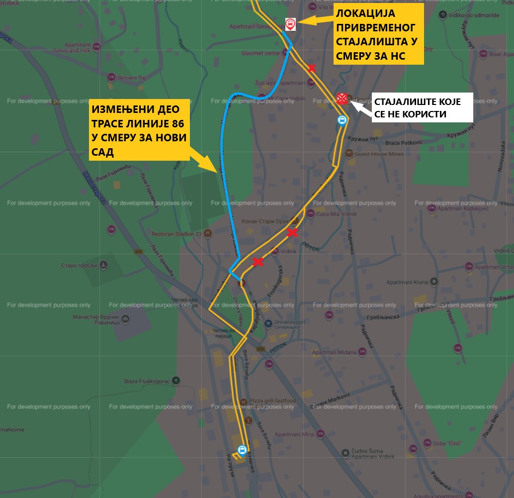 У складу са обавештењем о затварању Фрушкогорске и Радничке улице у Врднику, због извођења радова на реконструкцији улице од 02. децембра 2025. године до 16. јануара 2026. године привремено ће бити измењен део трасе линије број 86.